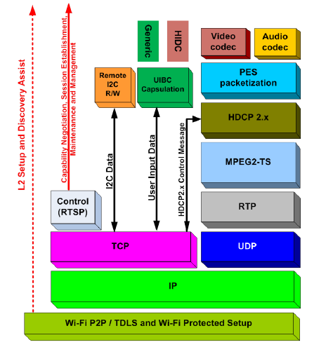 Miracast采用點(diǎn)對(duì)點(diǎn)Wi-FiDirect標(biāo)準(zhǔn)。它允許發(fā)送高達(dá)1080p高清視頻(H.264編解碼器)和5.1環(huán)繞聲(AAC和AC3是可選編解碼器,強(qiáng)制編解碼器是線性脈沖編碼調(diào)制–16位48kHz2通道)。連接是通過WPS創(chuàng)建的,因此使用WPA2進(jìn)行保護(hù)。IPv4用于Internet層。在傳輸層上,使用TCP或UDP。在應(yīng)用層,通過RTSP,RTP啟動(dòng)和控制流以進(jìn)行數(shù)據(jù)傳輸。