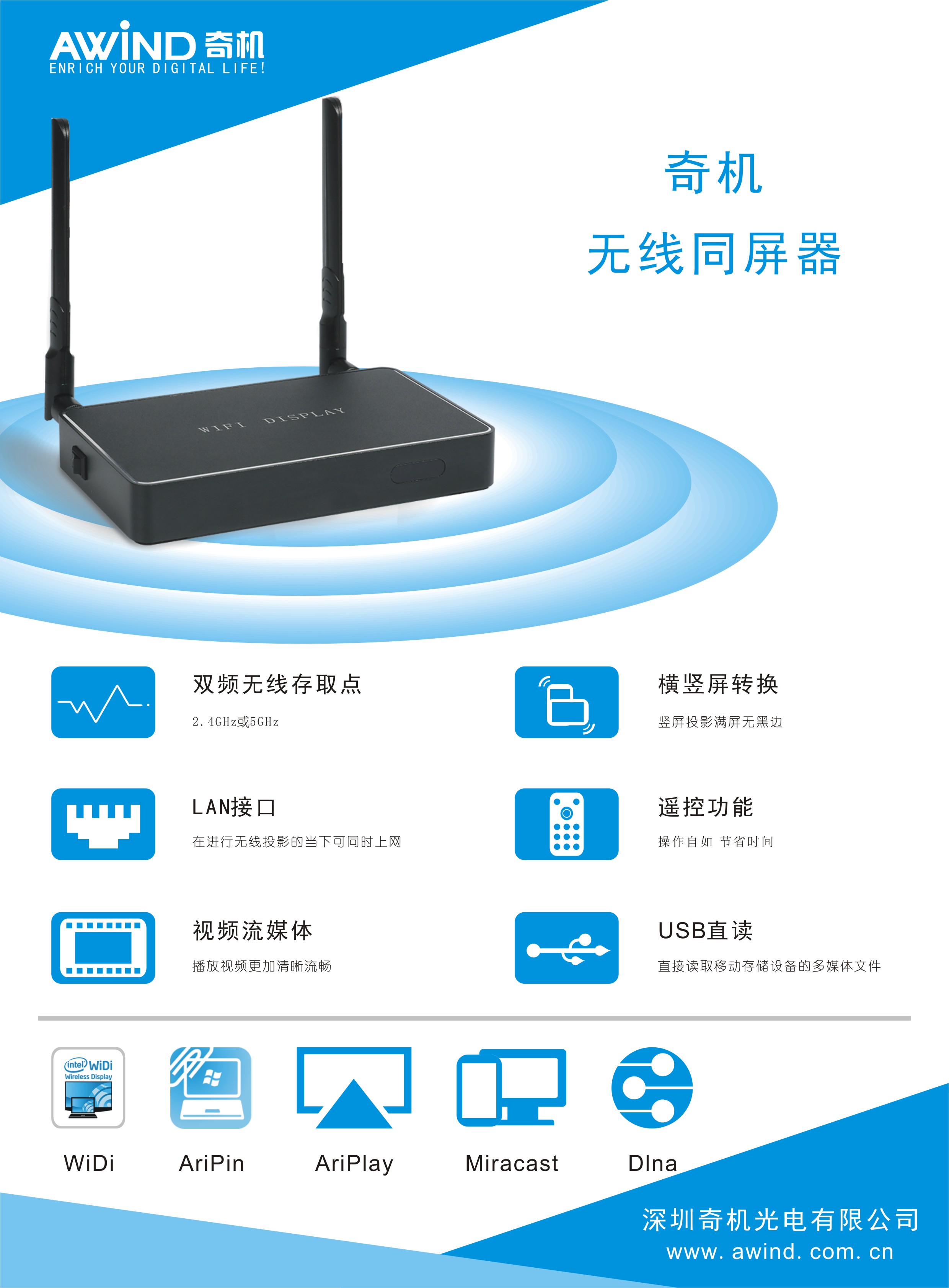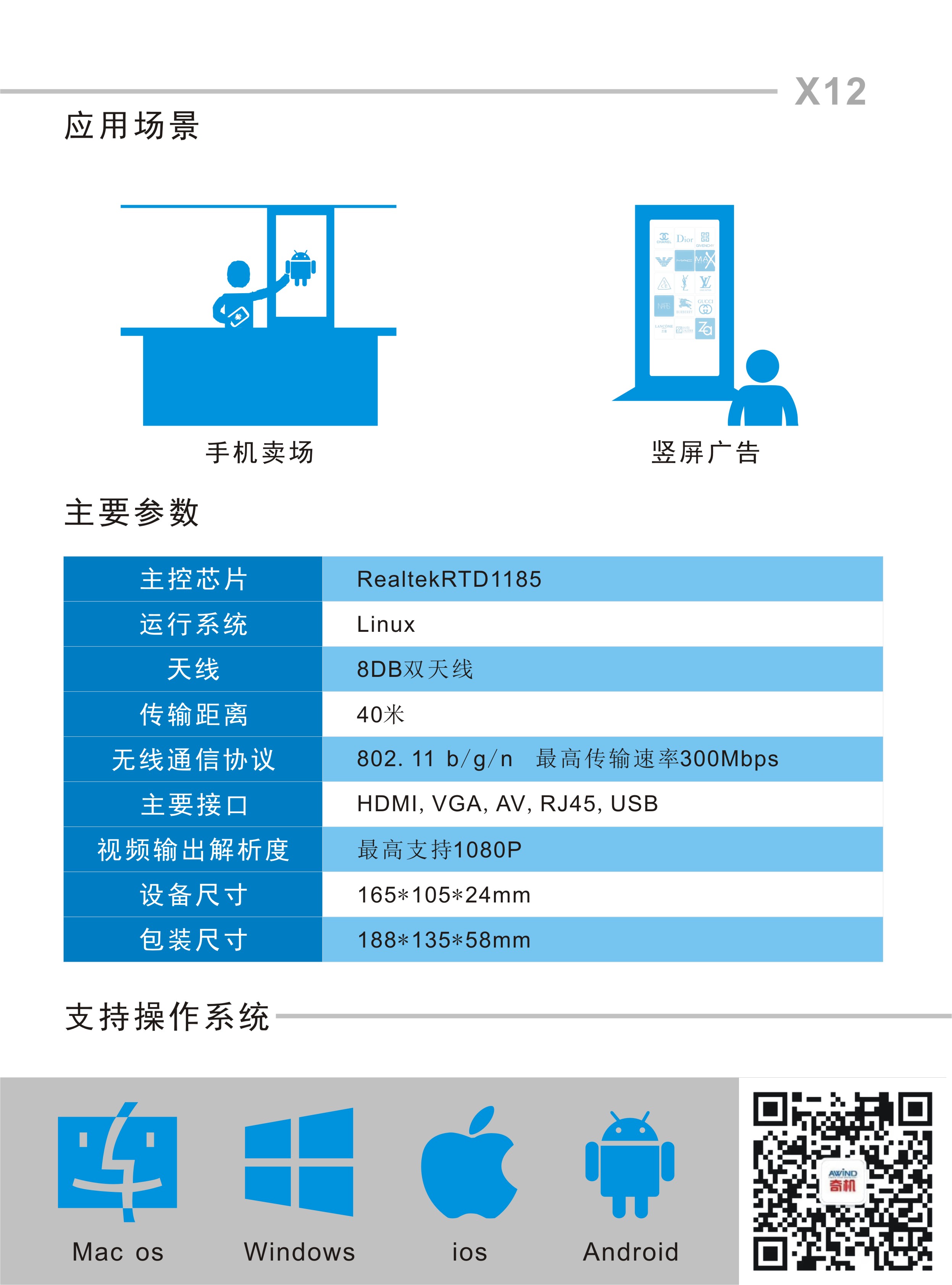 Awind奇機(jī)X12手機(jī)豎屏無(wú)線同屏器 2.4G和5G雙頻支持安卓Miracast、蘋果Airplay