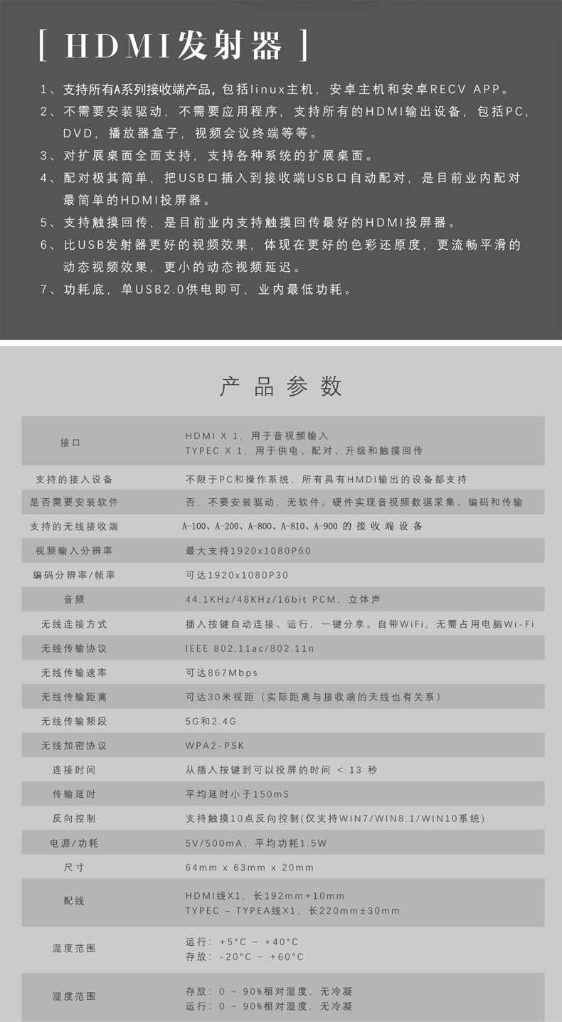 連接時間 | 從插入按鍵到可以投屏的時間 < 13 秒 |